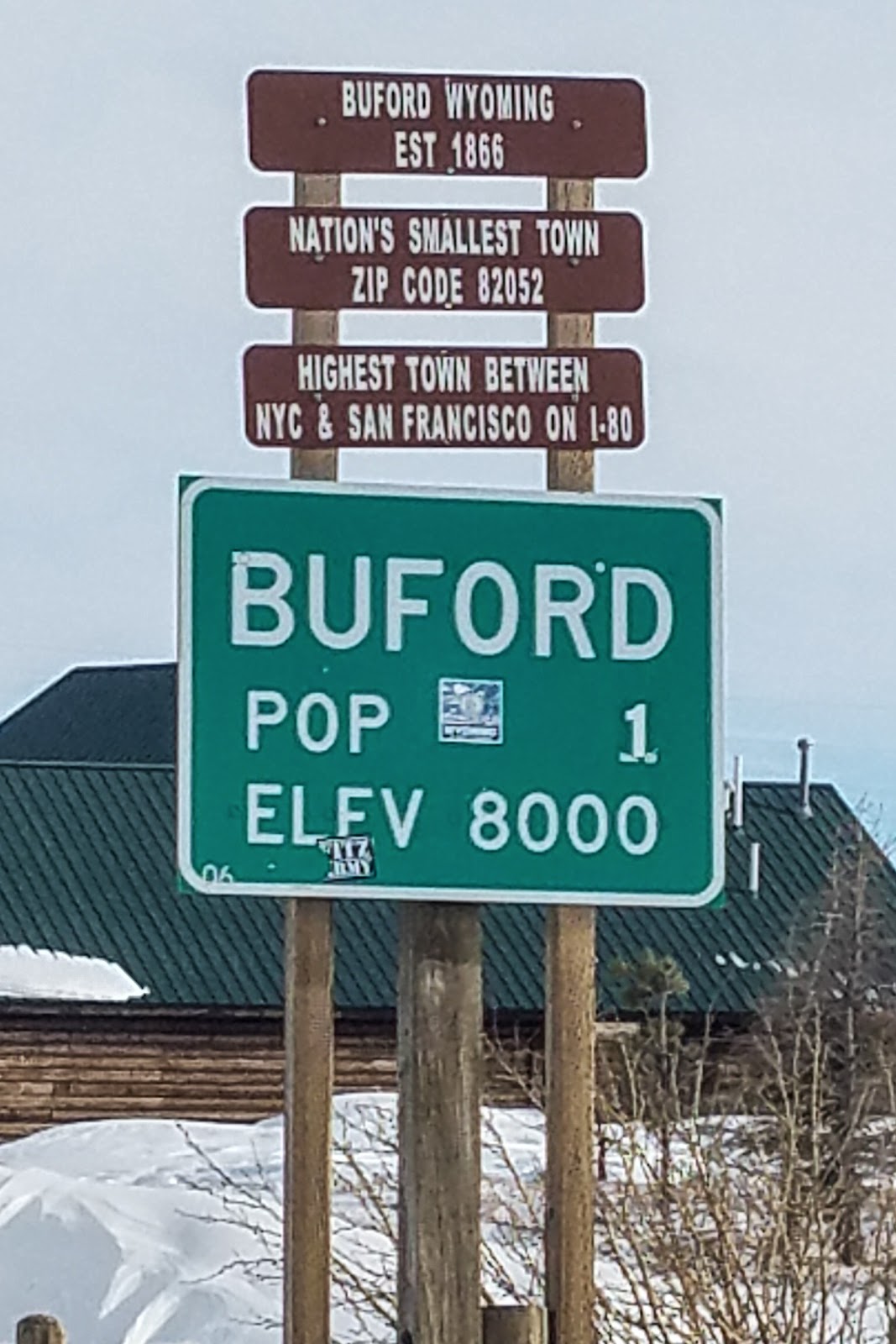 Buford, WY was established in 1866, is the smallest town in the US, and has a population of one living on 10 acres of land. The town consists of a post office, house, service station which sells Vietnamese coffee, and Ames Brothers monument.
