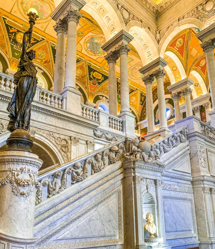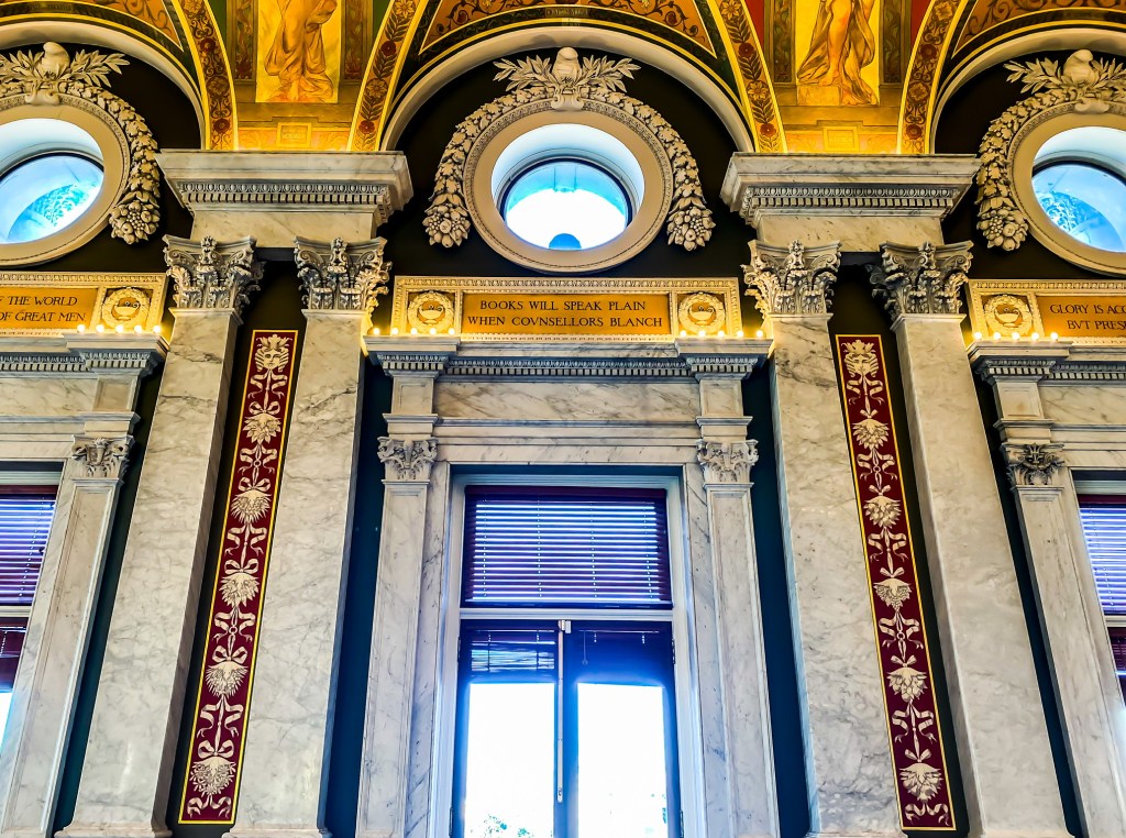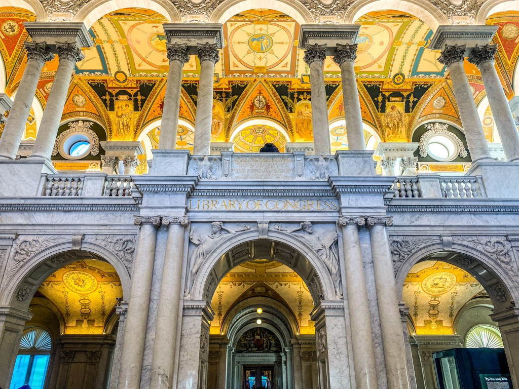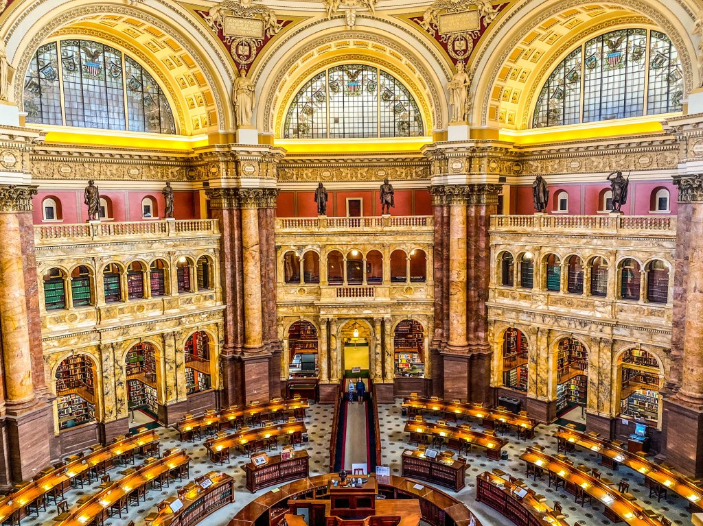 When you enter the Jefferson Building, guests should pickup a map and proceed to the top of the first floor where he/she can view the Gutenberg Bible, created in 1455. Afterwards, guests should proceed to the second floor to view Thomas Jefferson’s round library, which contains his personal collection of 6,487 volumes. Additionally while on the second floor, there is the Waldseemuller World Map, created in 1507, which is the first map to show America and overlook the Main Reading Room.