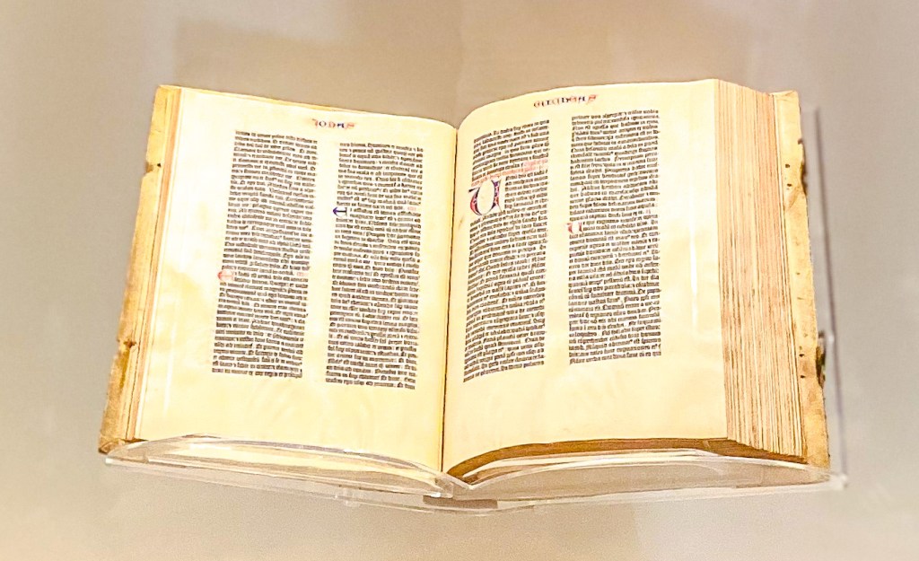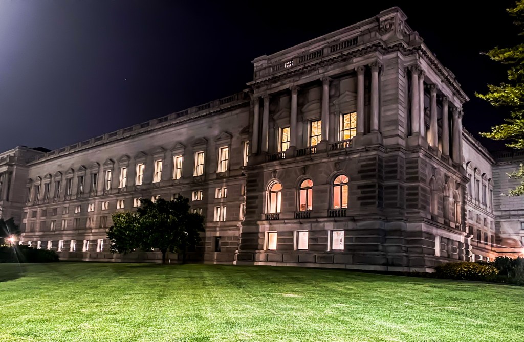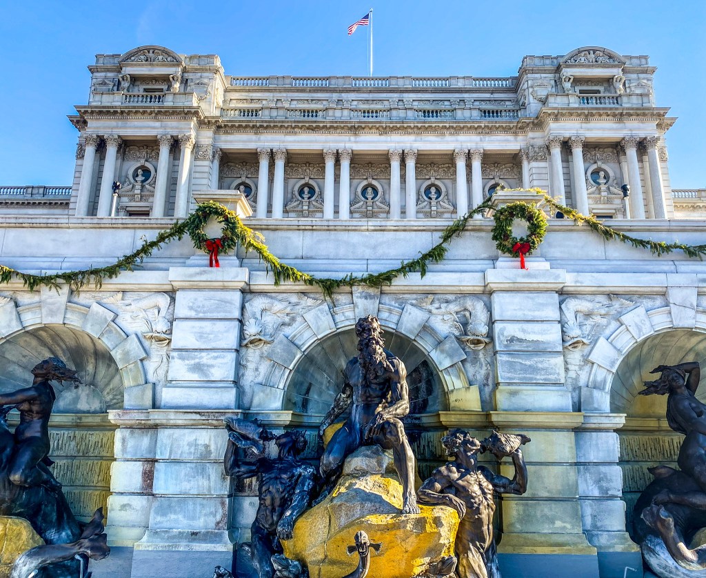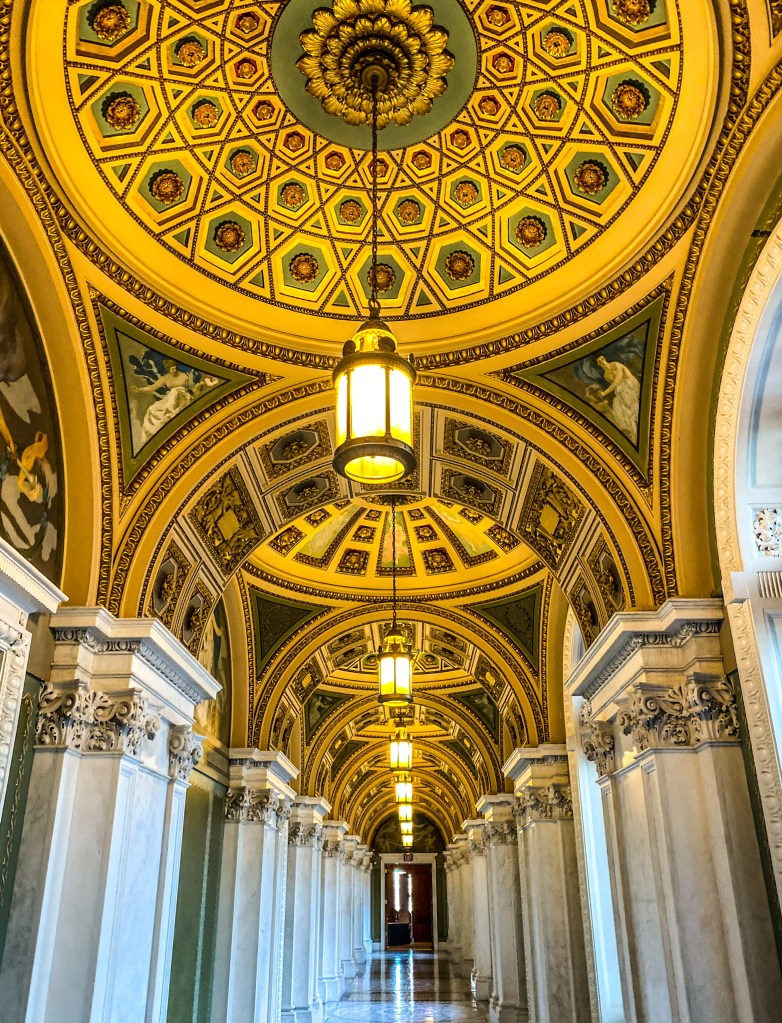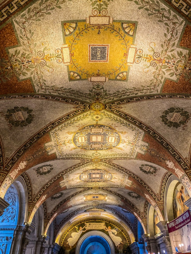 When you enter the Jefferson Building, guests should pickup a map and proceed to the top of the first floor where he/she can view the Gutenberg Bible, created in 1455. Afterwards, guests should proceed to the second floor to view Thomas Jefferson’s round library, which contains his personal collection of 6,487 volumes. Additionally while on the second floor, there is the Waldseemuller World Map, created in 1507, which is the first map to show America and overlook the Main Reading Room.